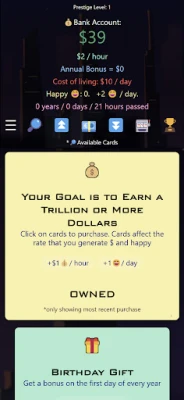 🌟 **Build Your Empire:** Begin your ascent to unimaginable wealth by strategically acquiring and upgrading resource-boosting cards. With each card purchase, watch as your earnings of both money and happiness skyrocket, setting the stage for an exponential cascade of riches.